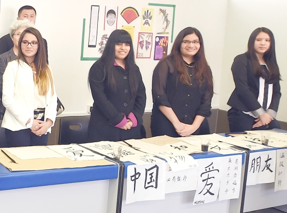 ??? 隨后,張德江走進一間教室,這里掛著紅紅的“中國結(jié)”、燈籠,墻上貼著一幅對聯(lián)“根深則葉茂,源遠而流長”。學(xué)生們有的在看中文書、有的在剪紙、還有的在練書法。