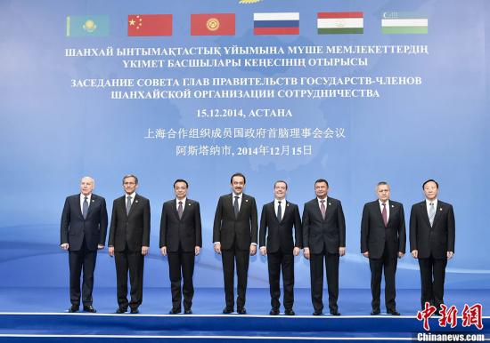 ???? 12月15日,中國國務院總理李克強在阿斯塔納出席上海合作組織成員國政府首腦理事會第十三次會議。這是與會各國代表團團長集體合影。中新社記者 劉震 攝
