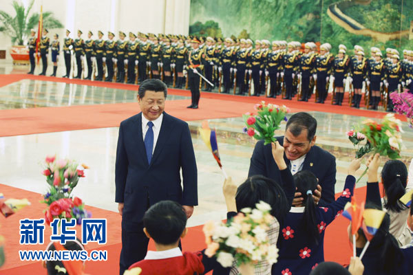 ??? 1月7日,國家主席習近平在北京人民大會堂同厄瓜多爾總統科雷亞舉行會談。這是會談前,習近平在人民大會堂北大廳為科雷亞舉行歡迎儀式。新華社記者姚大偉攝