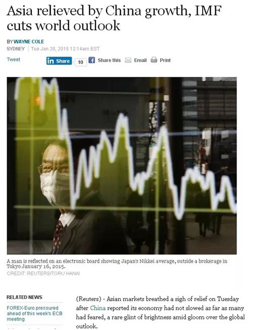 路透社1月20日?qǐng)?bào)道稱中國經(jīng)濟(jì)發(fā)展腳步放緩程度仍舊保持在預(yù)期范圍內(nèi),并沒有許多人想象中的那樣嚴(yán)重,使得整個(gè)亞洲市場松了口氣。