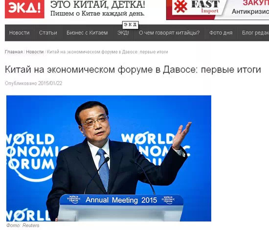 以介紹中國社會(huì)和經(jīng)濟(jì)發(fā)展為主的網(wǎng)站chinababe.ru22日發(fā)表文章,盤點(diǎn)了中國在此次達(dá)沃斯論壇上取得的初步成果。文章稱,中國代表團(tuán)由李克強(qiáng)總理率領(lǐng)。目前,中國是世界第二大經(jīng)濟(jì)體,國際社會(huì)非常關(guān)注中國的經(jīng)濟(jì)發(fā)展規(guī)模和速度。在論壇期間,李克強(qiáng)總理有關(guān)中國經(jīng)濟(jì)轉(zhuǎn)型,特別是對(duì)中國經(jīng)濟(jì)增長速度的闡釋打消了國際社會(huì)的顧慮。