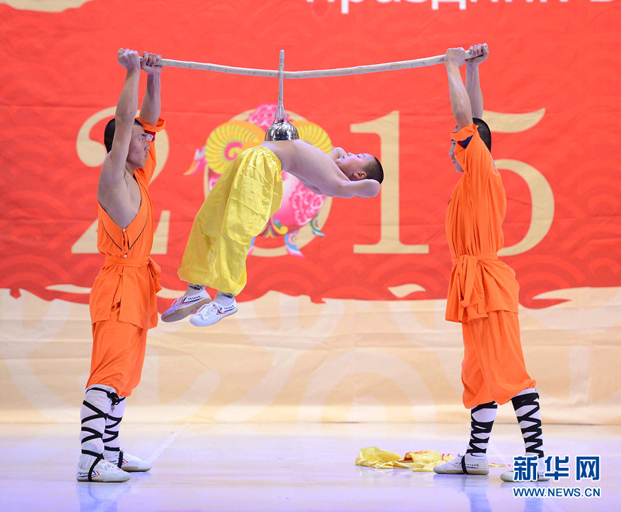 2月4日晚,在烏茲別克斯坦首都塔什干突厥宮,藝術(shù)家在表演中國武術(shù)和舞蹈。新華網(wǎng)記者 沙達提 攝