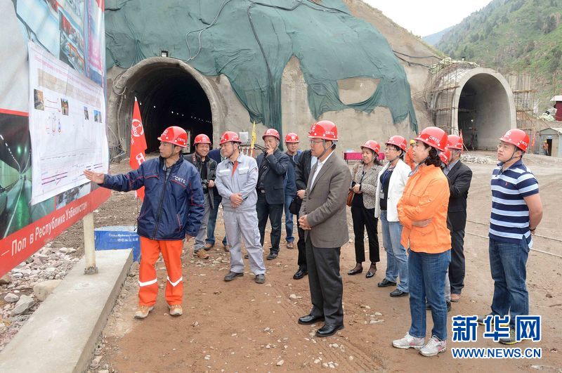 5月1日,中國駐烏茲別克斯坦大使孫立杰在中國企業承建的“安格連—帕普”鐵路隧道施工現場。沙達提 攝