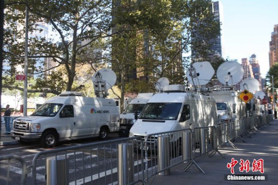 當(dāng)?shù)貢r(shí)間9月24日,電視媒體轉(zhuǎn)播車在紐約聯(lián)合國總部外云集。聯(lián)合國發(fā)展峰會(huì)將于25日至27日舉行,150余位世界各國領(lǐng)導(dǎo)人將出席本次峰會(huì)。 中新社記者 鄧敏 攝
