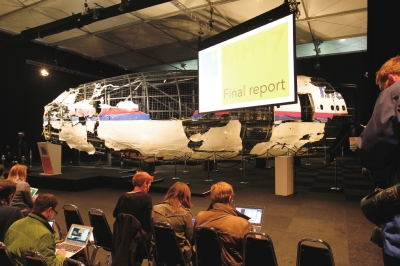 13日下午在海牙舉行的新聞發(fā)布會(huì)上,荷蘭調(diào)查人員展示了MH17航班前半截殘骸的重組。調(diào)查人員給在墜機(jī)現(xiàn)場(chǎng)尋獲的每塊殘骸編號(hào)、拍照、掃描、分組,在荷蘭南部的希爾澤-賴恩空軍基地部分還原了客機(jī)機(jī)鼻、駕駛艙和商務(wù)艙。當(dāng)扭曲且布滿彈孔的客機(jī)殘骸出現(xiàn)在眼前時(shí),現(xiàn)場(chǎng)媒體記者一片沉寂。
