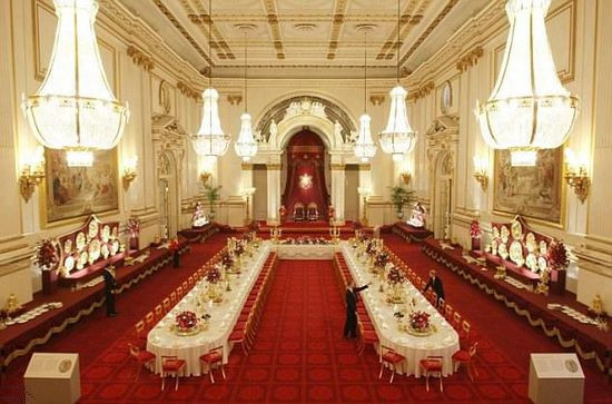 36.6米長、18米寬、13.5米高的宴會廳(the Ballroom)是白金漢宮最大的房間,女王招待國外元首的國宴都在這里舉行。國宴一般由四道菜組成,白金漢宮的廚房可以同時供應600位賓客一起用餐。