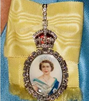女王的徽章由黃色緞帶、女王年輕時(shí)的畫像和一頂用紅色琺瑯裝飾的都鐸皇冠組成。