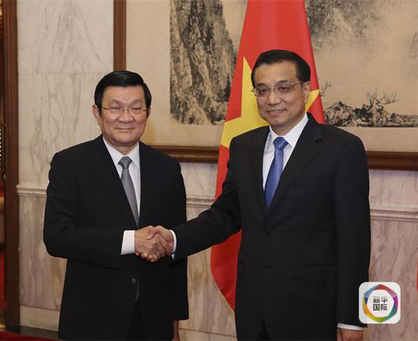 2013年6月20日,國(guó)務(wù)院總理李克強(qiáng)在北京釣魚(yú)臺(tái)國(guó)賓館會(huì)見(jiàn)越南國(guó)家主席張晉創(chuàng)。