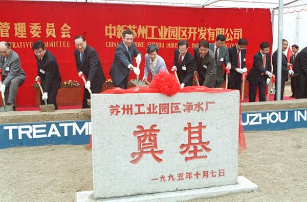為了加快蘇州工業園區的建設,中新兩國政府聯合協調理事會第二次會議1995年10月7日在江蘇蘇州舉行。新加坡副總理李顯龍、中國副總理李嵐清主持了這次會議。圖為1995年10月7日會議代表參加蘇州凈水廠的奠基儀式,左三為李嵐清,左四為李顯龍。