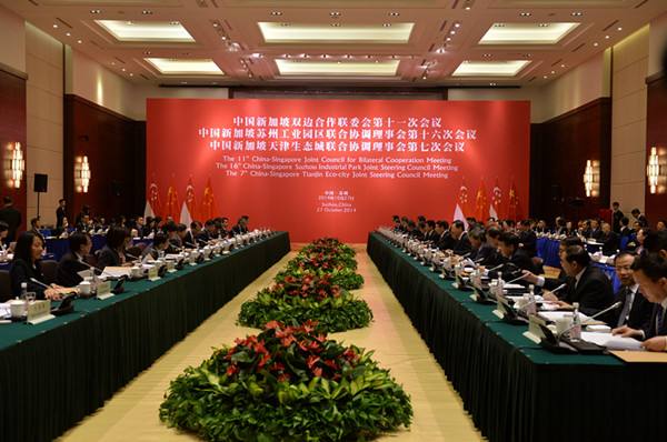 圖為10月27日拍攝的中新三個高層合作機制會議現場。2014年10月27日,中國新加坡雙邊合作聯委會第十一次會議、中國新加坡蘇州工業園區聯合協調理事會第十六次會議和中國新加坡天津生態城聯合協調理事會第七次會議在蘇州舉行。