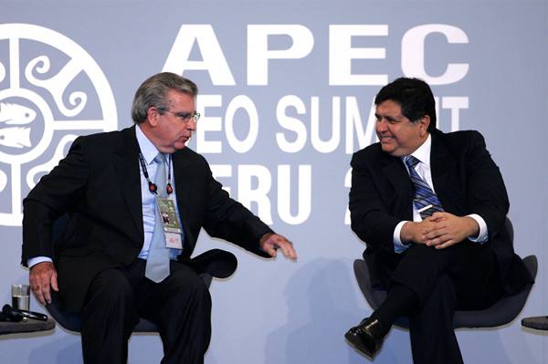 2008年11月21日,秘魯總統加西亞(右)與APEC工商領導人峰會主席莫拉萊斯在開幕式上交談。