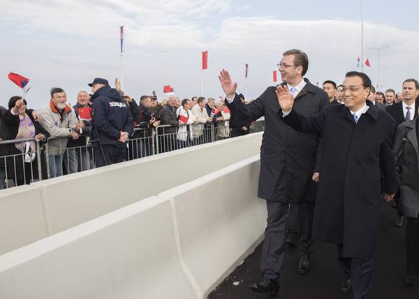 2014年12月18日,李克強總理與塞爾維亞總理武契奇共同出席貝爾格萊德跨多瑙河大橋竣工儀式。這是李克強與武契奇在儀式現場向民眾揮手致意。(新華社記者黃敬文攝)