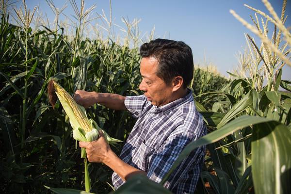 2015年11月11日,在津巴布韋奇諾伊的溫亞尼農場上,中方企業晥津公司總經理何宏順展示農場出品的青玉米。(新華社記者許林貴攝)