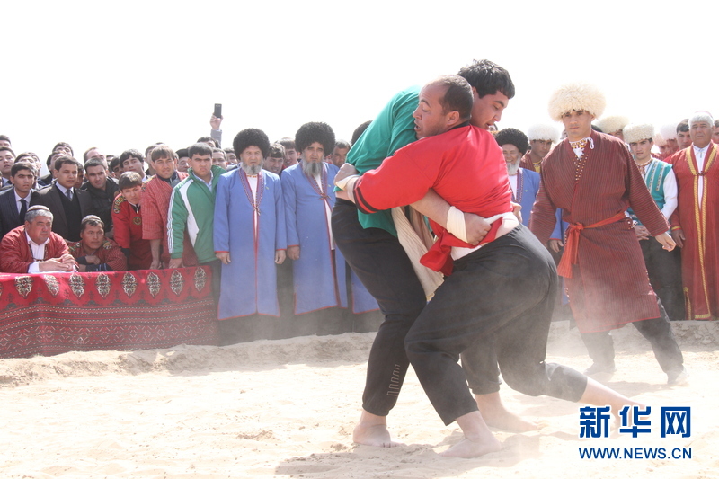 3月21日,在土庫曼斯坦首都阿什哈巴德,現(xiàn)場進(jìn)行摔跤比賽。新華社記者盧敬利 攝