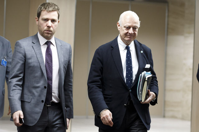 3月18日,在瑞士日內瓦聯合國歐洲總部,聯合國敘利亞問題特使德米斯圖拉(右)準備參加敘利亞問題新一輪和談。 新華社/美聯