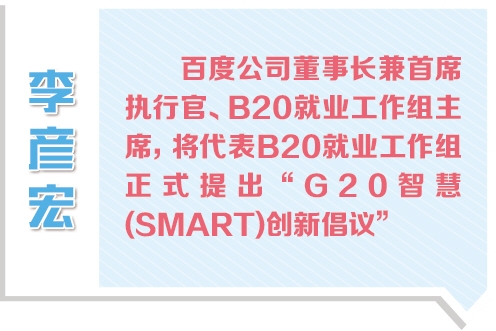 就業是B20的重點議題之一,也是當今世界面臨的重要問題之一。如何創造更加充分、更高質量的就業機會,推動實現經濟的持續和平衡增長,是各國面臨的重要任務。根據G20杭州峰會的“創新增長方式”議題,B20就業工作組主席、百度公司董事長兼首席執行官李彥宏代表B20就業工作組提出了“G20智慧(SMART)創新倡議”。這一倡議得到了二十國集團工商界、商協會、國際機構和智庫代表的廣泛認可。