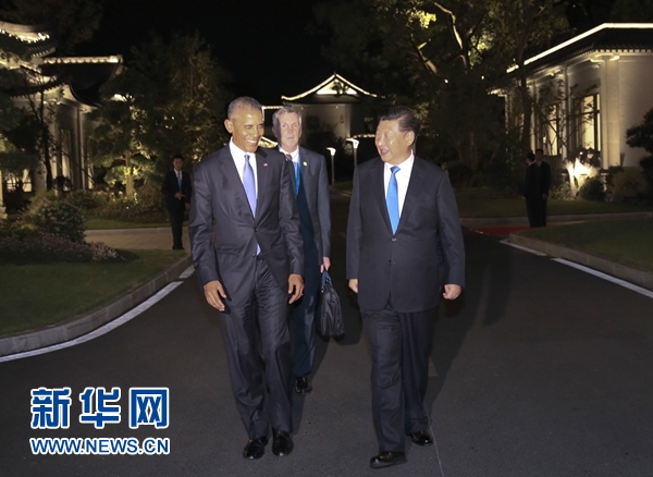 9月3日晚,國(guó)家主席習(xí)近平在杭州西湖國(guó)賓館與前來(lái)出席二十國(guó)集團(tuán)領(lǐng)導(dǎo)人杭州峰會(huì)的美國(guó)總統(tǒng)奧巴馬交談。 新華社記者 蘭紅光 攝