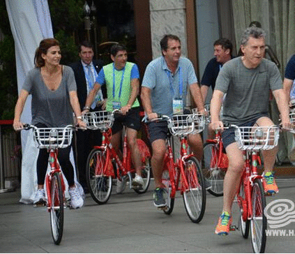 阿根廷總統馬克里在岸邊騎杭州公共自行車
