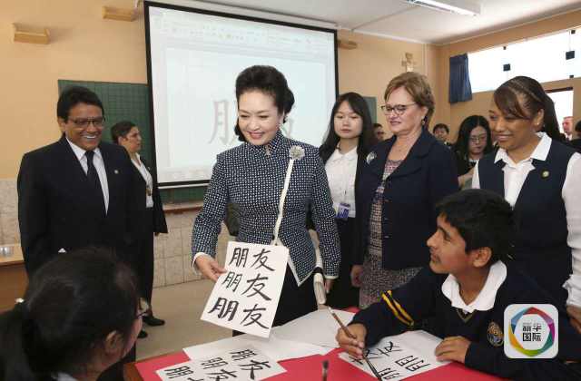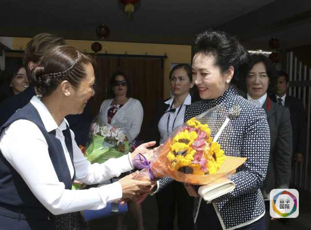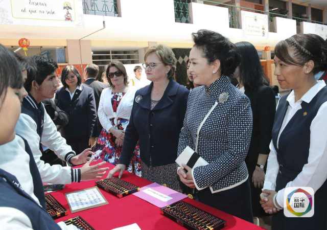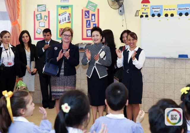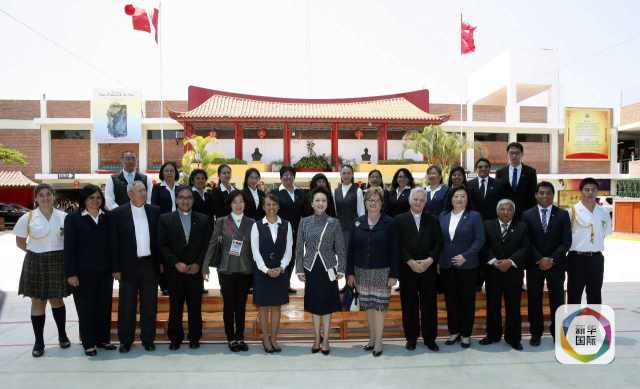 ??? 彭麗媛抵達時,秘魯總統夫人蘭格和學校校長在下車處迎接,校長為彭麗媛獻上鮮花。若望二十三世秘中學校創辦于1962年,是從幼兒園到中學教育的全日制學校,也是秘魯乃至南美洲最具影響的華文學校之一。