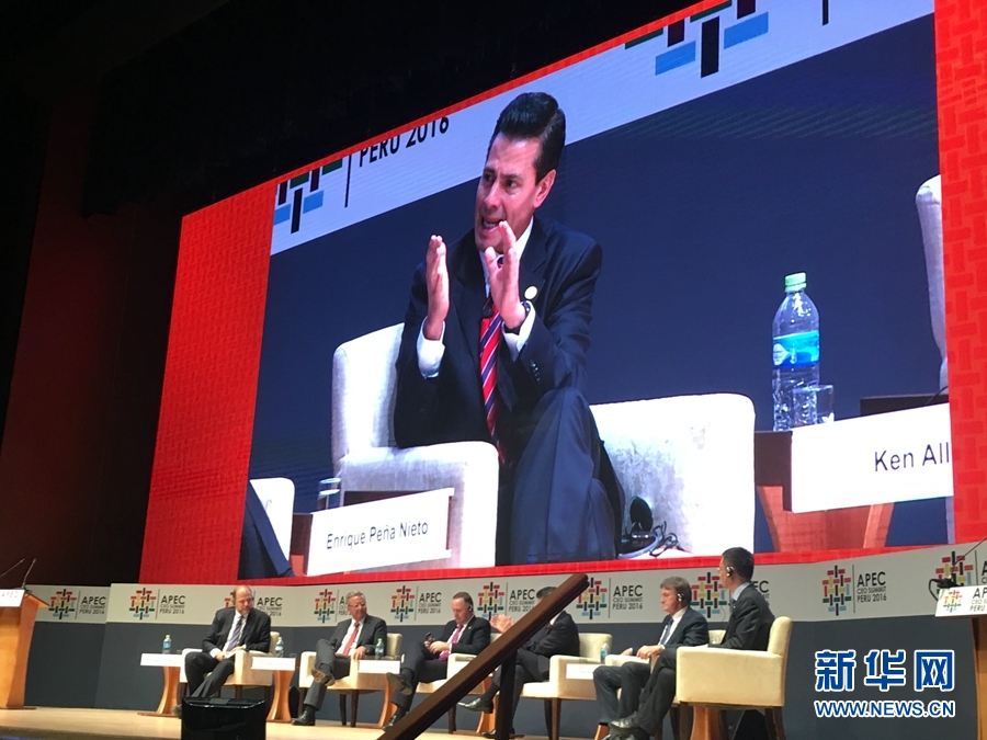 ????新華網北京11月22日電 當地時間11月19日,APEC工商領導人峰會舉行主題為“重新設計貿易”的現場討論會。圖為墨西哥總統涅托在討論會上發言。