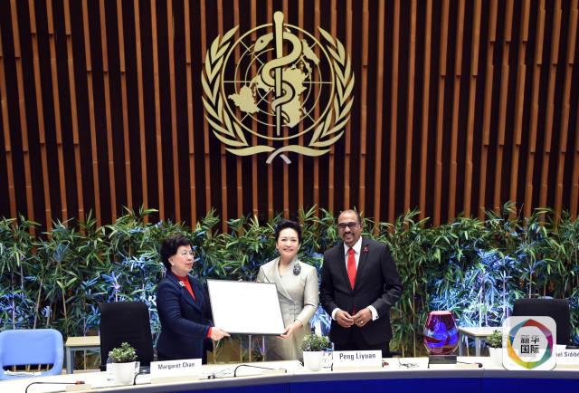 當地時間18日下午5時許,在熱烈的掌聲中,世界衛生組織總干事陳馮富珍和聯合國艾滋病規劃署執行主任西迪貝向彭麗媛頒發親善大使任期續延證書、世衛組織榮譽勛章和艾滋病防治“杰出成就獎”獲獎證書及獎杯,并合影留念。
