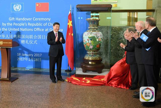 ——向萬國宮贈送景泰藍(lán)瓶。萬國宮一層大廳內(nèi),習(xí)主席和古特雷斯共同為名為“盛世歡歌”的景泰藍(lán)瓶揭幕。