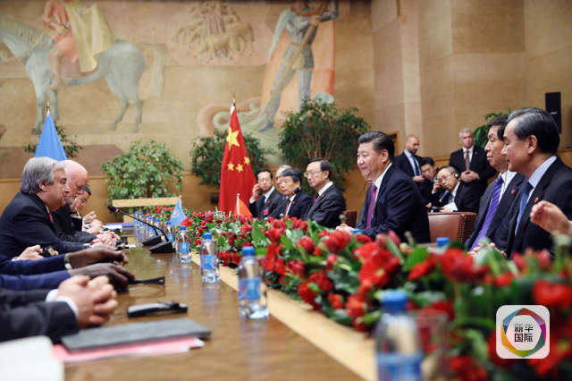 1月18日,國(guó)家主席習(xí)近平在瑞士日內(nèi)瓦萬(wàn)國(guó)宮會(huì)見(jiàn)第71屆聯(lián)合國(guó)大會(huì)主席湯姆森和聯(lián)合國(guó)秘書(shū)長(zhǎng)古特雷斯。(新華社記者蘭紅光攝)
