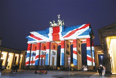 3月23日,在德國(guó)首都柏林,英國(guó)國(guó)旗樣式的彩燈點(diǎn)亮勃蘭登堡門,悼念英國(guó)倫敦恐怖襲擊事件中的遇難者。 新華社記者 單宇琦攝