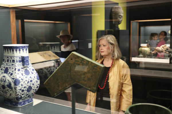 勞里·巴恩斯正在展館內觀看中國文物。(新華社記者王迎攝)