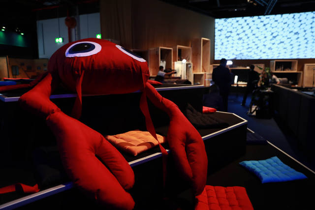 ↑這是7月6日在德國漢堡拍攝的G20領導人峰會國際新聞中心餐飲區(qū)擺放的螃蟹造型玩偶。新華社記者羅歡歡攝