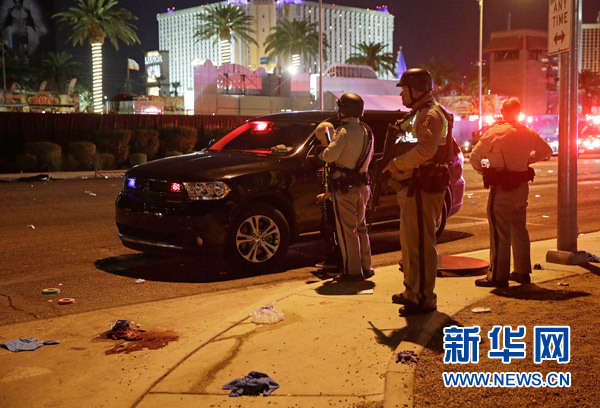 10月2日,在美國西部城市拉斯維加斯,警察在槍擊事件現(xiàn)場警戒。新華社/美聯(lián)