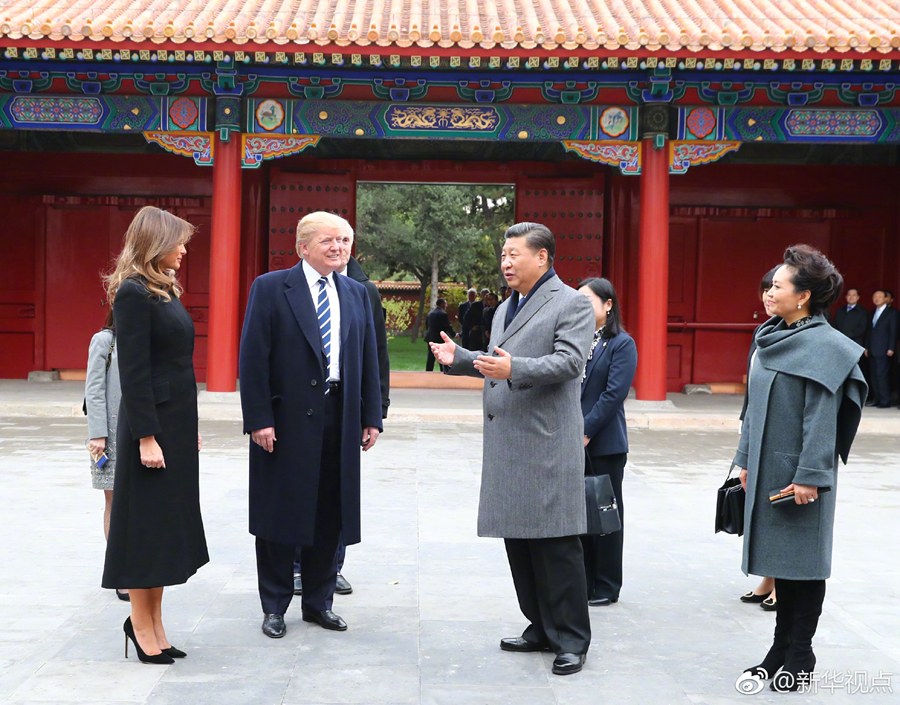 新華網(wǎng)北京11月8日電 國家主席習近平和夫人彭麗媛8日下午在故宮博物院迎接來華進行國事訪問的美國總統(tǒng)特朗普和夫人梅拉尼婭。兩國元首夫婦在寶蘊樓簡短茶敘。