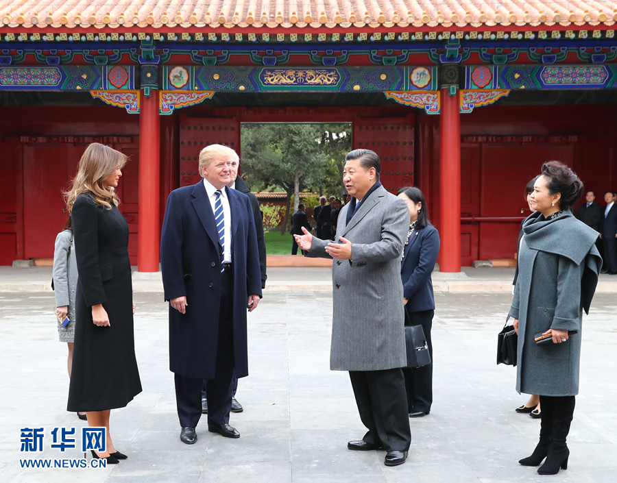 11月8日下午,國家主席習近平和夫人彭麗媛在北京故宮博物院迎接來華進行國事訪問的美國總統(tǒng)特朗普和夫人梅拉尼婭。兩國元首夫婦在寶蘊樓簡短茶敘。新華社記者謝環(huán)馳攝
