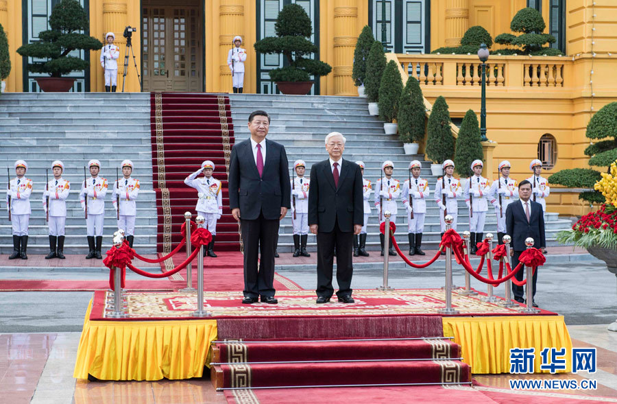 11月12日,中共中央總書記、國家主席習近平在河內越共中央駐地同越共中央總書記阮富仲舉行會談。這是會談前,阮富仲在主席府廣場為習近平舉行盛大歡迎儀式。 新華社記者 李濤 攝