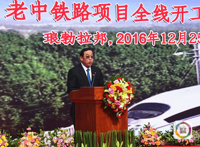 2016年12月25日,老中鐵路項(xiàng)目全線開工儀式在老撾瑯勃拉邦舉行,老撾公共工程與運(yùn)輸部部長(zhǎng)奔占·辛塔馮在開工儀式上致辭。(新華社發(fā))