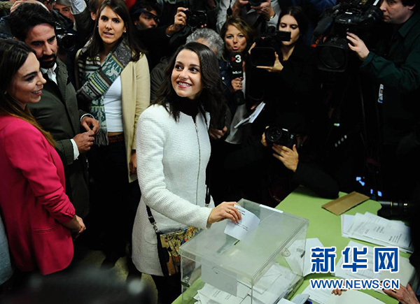 12月21日,在西班牙巴塞羅那,公民黨候選人伊內斯·阿里馬達斯(中)在一處投票站投票。新華社記者郭求達攝