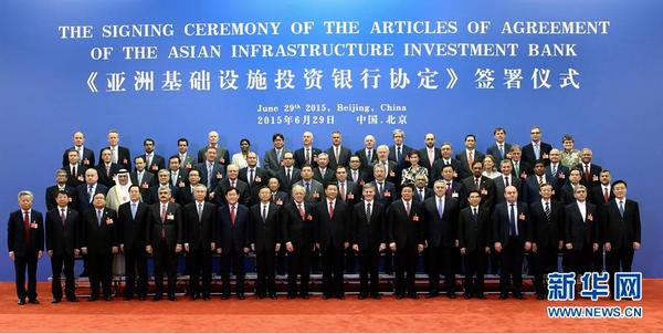 【正式成立】2015年12月25日,歷經800余天籌備,由中國倡議成立、57國共同籌建的亞洲基礎設施投資銀行(亞投行)于當日正式成立,全球迎來首個由中國倡議設立的多邊金融機構。圖為2015年6月29日,國家主席習近平在北京人民大會堂會見出席《亞洲基礎設施投資銀行協定》簽署儀式的各國代表團團長。
