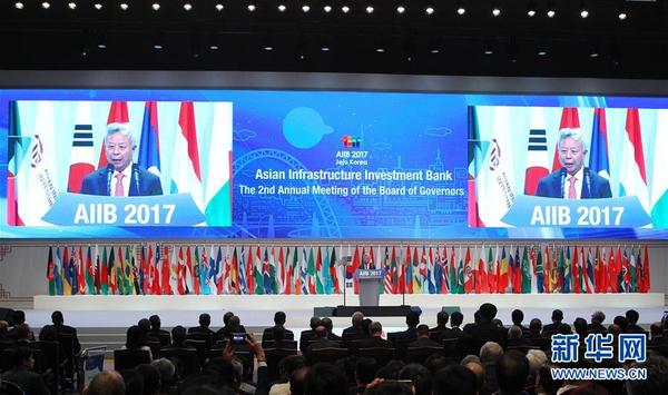 【第三次“吸粉”】2017年6月16日,亞投行宣布其理事會已批準3個新意向成員加入,分別為阿根廷、馬達加斯加和湯加。至此,亞投行成員總數擴至80個。圖為2017年6月16日,韓國濟州,亞投行第二屆年會開幕式現場。