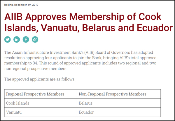 【第四次“擴容”】2017年12月19日,亞投行宣布批準庫克群島、瓦努阿圖、白俄羅斯和厄瓜多爾四個成員的加入申請,成員增至84個,這是亞投行自開業以來的第四次“擴容”。圖為亞投行官網截圖。(新華網國際頻道 徐海知)