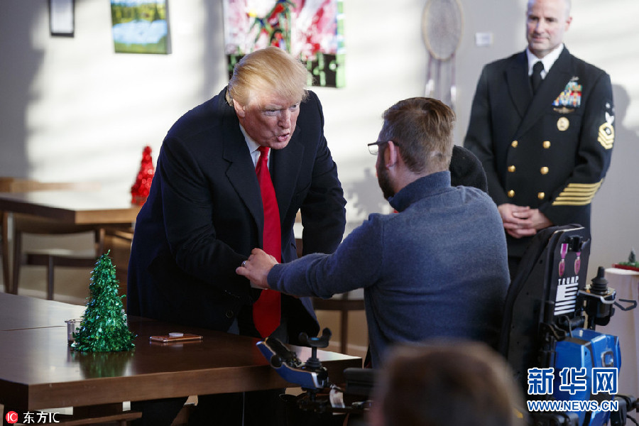 當(dāng)?shù)貢r(shí)間21日,美國(guó)馬里蘭州,美國(guó)總統(tǒng)特朗普訪問沃爾特-里德國(guó)家軍事醫(yī)療中心,慰問受傷士兵和家屬,并與退伍的海軍陸戰(zhàn)隊(duì)中士John Peck交談。