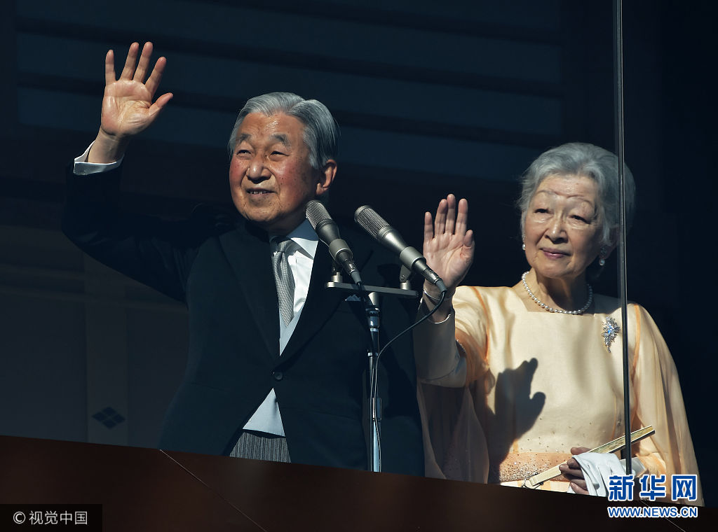 當(dāng)?shù)貢r間2017年12月23日,日本東京,日本明仁天皇慶祝84歲生日,在皇宮的陽臺上向祝福者揮手致意。(圖片來源:視覺中國)