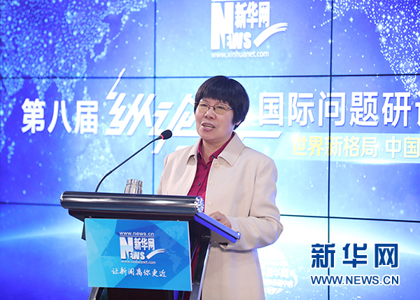 新華網(wǎng)第八屆“縱論天下”國際問題研討會近日成功舉行。圖為中國現(xiàn)代國際關(guān)系研究院研究員陳鳳英在發(fā)表主旨演講。新華網(wǎng)發(fā) 郭小天攝