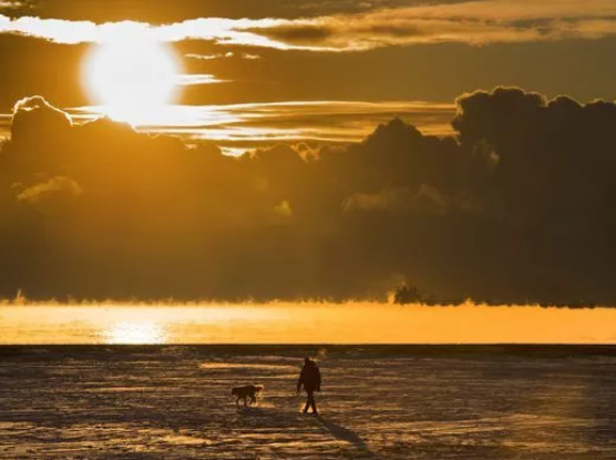 在冰凍的湖面上遛狗,竟然有一種油畫般的詩(shī)意美呢。