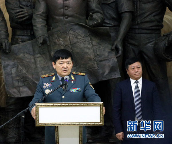 哈薩克斯坦國防部副部長穆赫塔羅夫在圖片展開幕式上致辭。新華網發