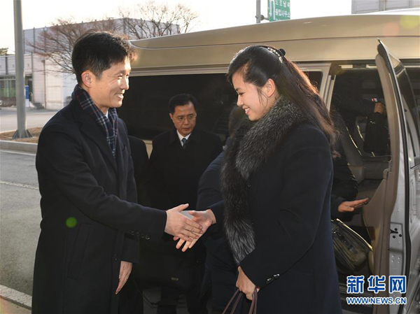 1月21日,朝鮮三池淵管弦樂團團長玄松月(右)到達位于朝韓邊境的韓國京畿道坡州市京義線韓朝出入境事務所。新華社發(fā)(韓國統(tǒng)一部提供)