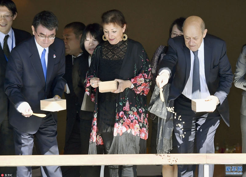 當(dāng)?shù)貢r間2018年1月27日,日本東京,日本外相河野太郎接待到訪的法國外長讓·伊夫·勒德里昂及其夫人,帶其參觀赤坂宮,體驗(yàn)喂魚。(圖片來源:東方ic)