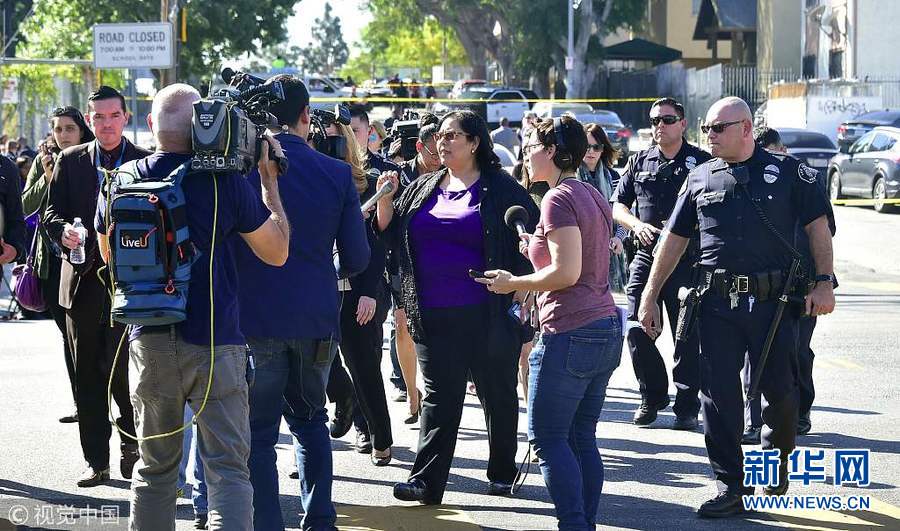 2月1日,美國洛杉磯,洛杉磯薩斯卡斯特羅(Sal Castro)中學發生槍擊案,已致2名學生送醫,且傷情不明。警方表示,現場情況已經得到控制,開槍的女學生已被羈押。但警方并未透露該學生的年齡和姓名。(圖片來源:視覺中國)