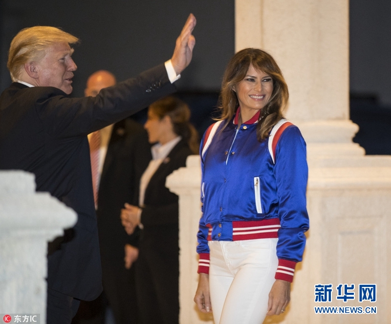 當地時間2018年2月4日,美國佛州西棕櫚灘,美國總統特朗普與第一夫人梅拉尼婭在高爾夫俱樂部觀看大學生樂隊的歡迎演出,與美女啦啦隊員握手。據悉,特朗普夫婦出席在該俱樂部舉辦的超級碗派對。(圖片來源:東方IC)