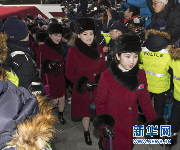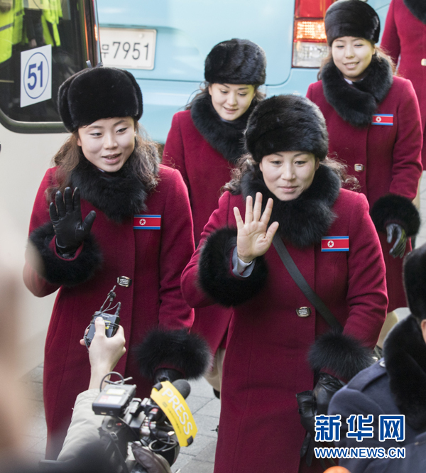 2月7日,朝鮮拉拉隊成員乘車到達韓國江原道麟蹄郡。當日,參加平昌冬奧會的朝鮮拉拉隊、跆拳道示范團、記者團和民族奧林匹克委員會官員等一行280人經由京義線陸路抵達韓國境內。新華社發(李相浩攝)
