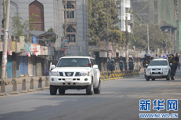 2月8日,在孟加拉國首都達卡,警察在街頭警戒。新華社發(fā)(薩利姆·禮薩 攝)
